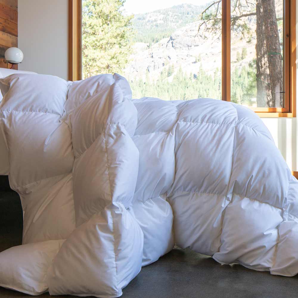 The shells on our core lineup of down comforters and pillows are woven from 400 threadcount, single ply, evenly woven cambric cotton. This assures the tightest downproof weave and a soft handfeel, for superior performance year after year.
