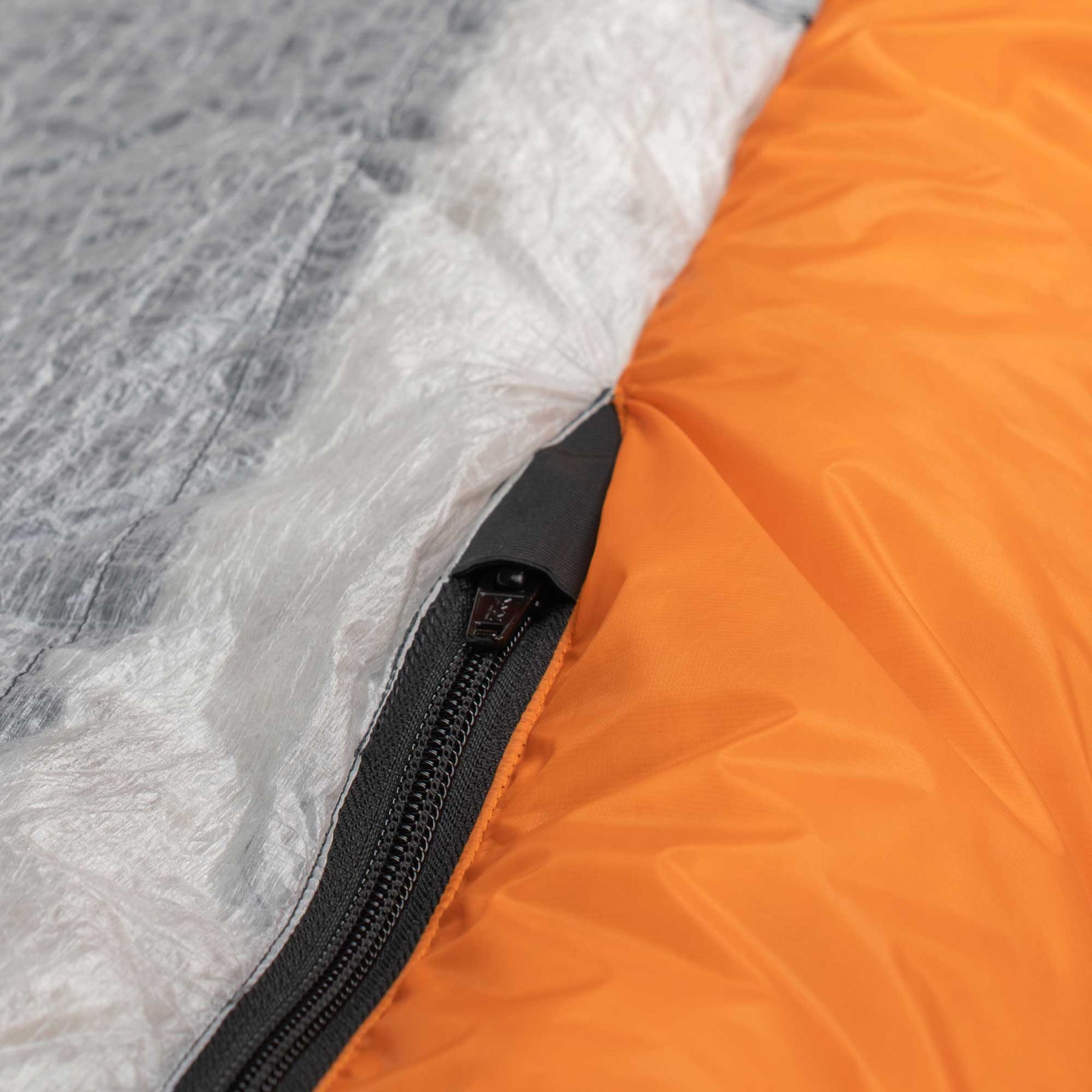 Zipper detail showing zipper garage and Dyneema floor on Flame orange Spoonbill UL 2-Person down sleeping bag
